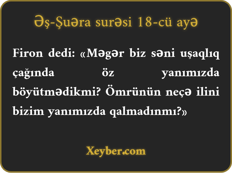 Firon dedi: «Məgər biz səni uşaqlıq çağında öz yanımızda böyütmədikmi? Ömrünün neçə ilini bizim yanımızda qalmadınmı?»