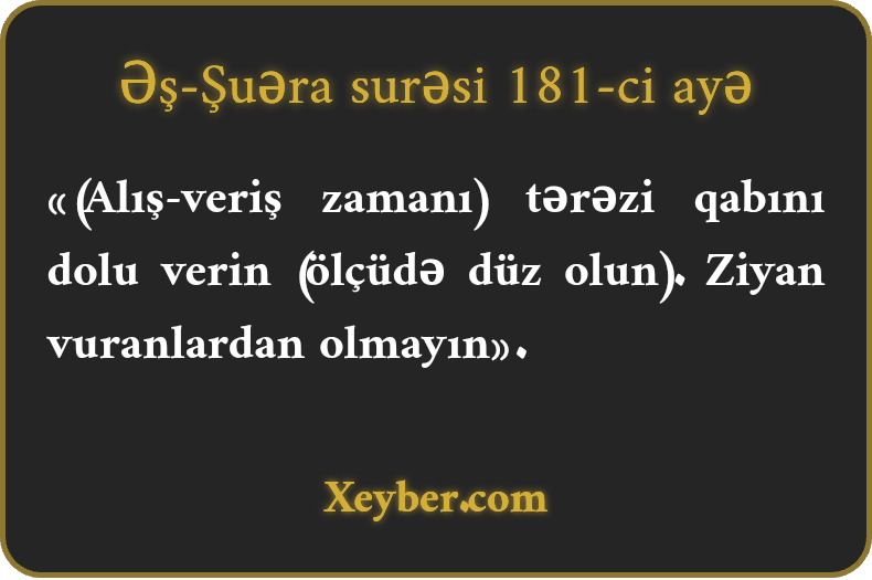 «(Alış-veriş zamanı) tərəzi qabını dolu verin (ölçüdə düz olun). Ziyan vuranlardan olmayın».