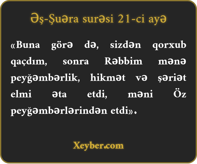 «Buna görə də, sizdən qorxub qaçdım, sonra Rəbbim mənə peyğəmbərlik, hikmət və şəriət elmi əta etdi, məni Öz peyğəmbərlərindən etdi».