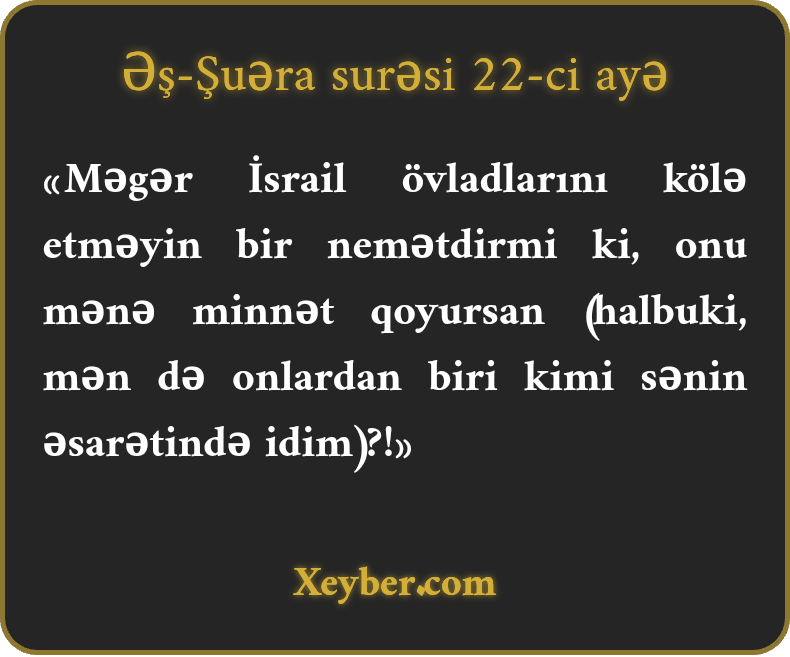 «Məgər İsrail övladlarını kölə etməyin bir nemətdirmi ki, onu mənə minnət qoyursan (halbuki, mən də onlardan biri kimi sənin əsarətində idim)?!»