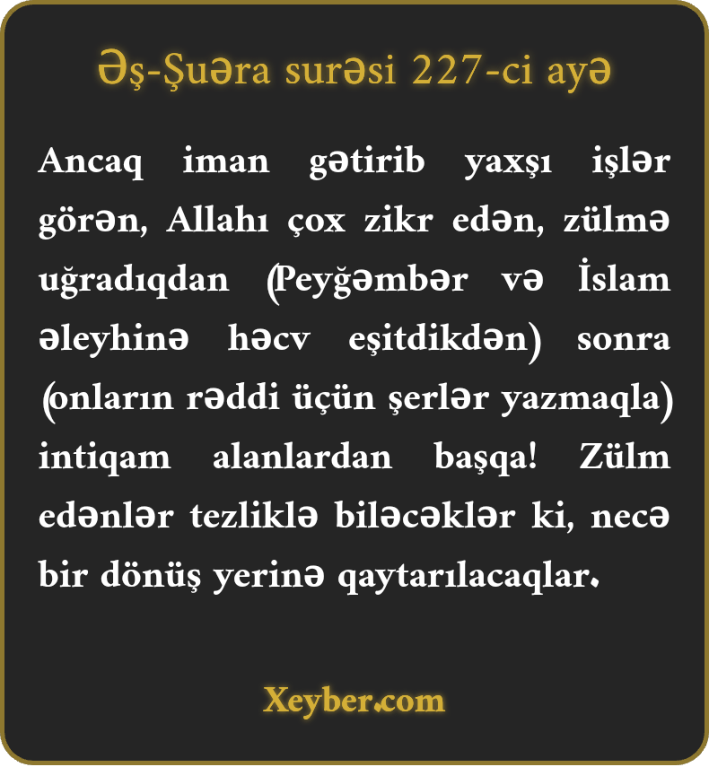 Ancaq iman gətirib yaxşı işlər görən, Allahı çox zikr edən, zülmə uğradıqdan (Peyğəmbər və İslam əleyhinə həcv eşitdikdən) sonra (onların rəddi üçün şerlər yazmaqla) intiqam alanlardan başqa! Zülm edənlər tezliklə biləcəklər ki, necə bir dönüş yerinə qaytarılacaqlar.