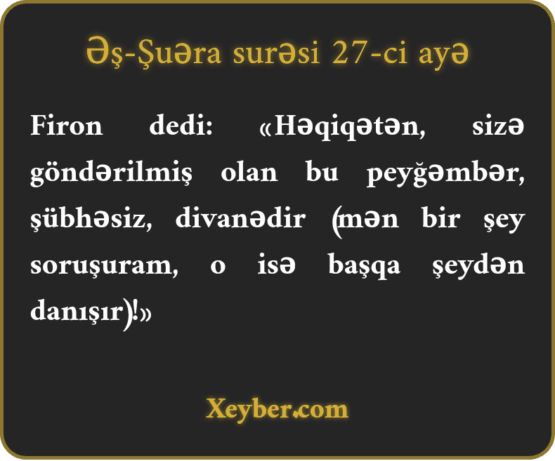 Firon dedi: «Həqiqətən, sizə göndərilmiş olan bu peyğəmbər, şübhəsiz, divanədir (mən bir şey soruşuram, o isə başqa şeydən danışır)!»