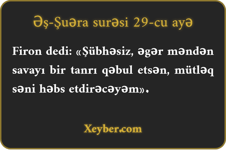 Firon dedi: «Şübhəsiz, əgər məndən savayı bir tanrı qəbul etsən, mütləq səni həbs etdirəcəyəm».