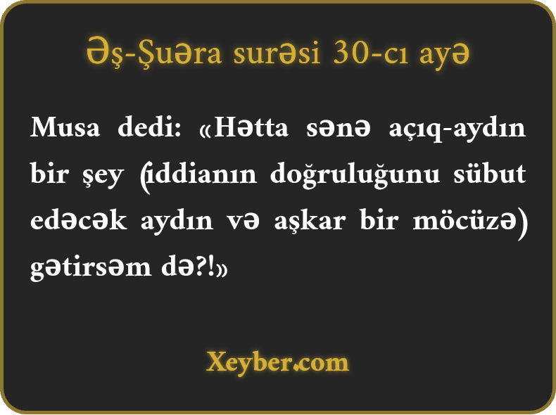 Musa dedi: «Hətta sənə açıq-aydın bir şey (iddianın doğruluğunu sübut edəcək aydın və aşkar bir möcüzə) gətirsəm də?!»