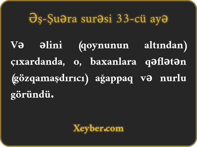 Və əlini (qoynunun altından) çıxardanda, o, baxanlara qəflətən (gözqamaşdırıcı) ağappaq və nurlu göründü.
