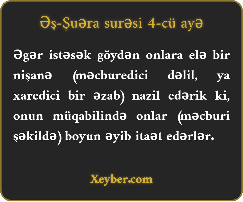 Əgər istəsək göydən onlara elə bir nişanə (məcburedici dəlil, ya xaredici bir əzab) nazil edərik ki, onun müqabilində onlar (məcburi şəkildə) boyun əyib itaət edərlər.