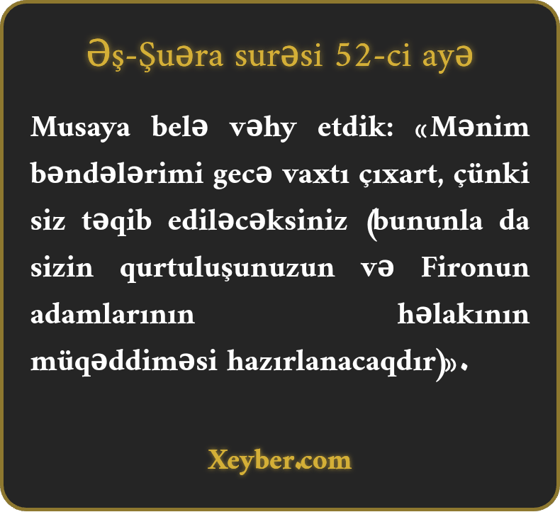 Musaya belə vəhy etdik: «Mənim bəndələrimi gecə vaxtı çıxart, çünki siz təqib ediləcəksiniz (bununla da sizin qurtuluşunuzun və Fironun adamlarının həlakının müqəddiməsi hazırlanacaqdır)».