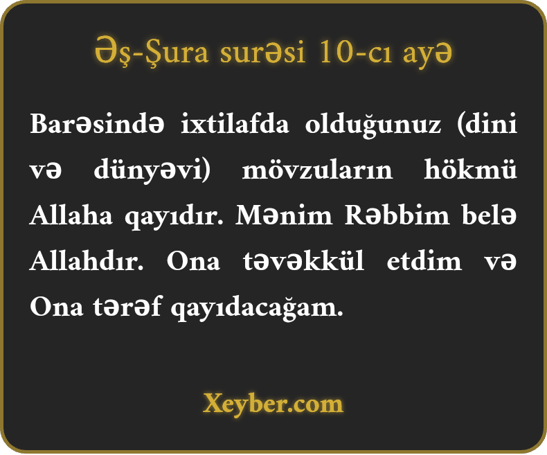 Barəsində ixtilafda olduğunuz (dini və dünyəvi) mövzuların hökmü Allaha qayıdır. Mənim Rəbbim belə Allahdır. Ona təvəkkül etdim və Ona tərəf qayıdacağam.
