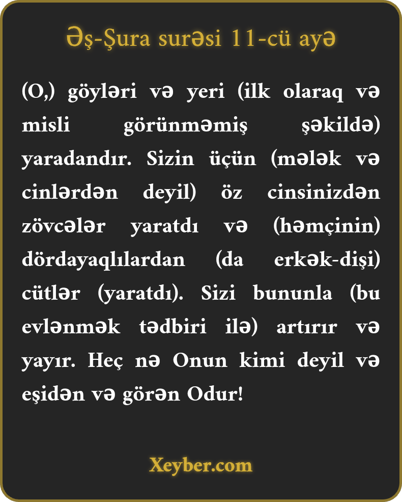 (O,) göyləri və yeri (ilk olaraq və misli görünməmiş şəkildə) yaradandır. Sizin üçün (mələk və cinlərdən deyil) öz cinsinizdən zövcələr yaratdı və (həmçinin) dördayaqlılardan (da erkək-dişi) cütlər (yaratdı). Sizi bununla (bu evlənmək tədbiri ilə) artırır və yayır. Heç nə Onun kimi deyil və eşidən və görən Odur!