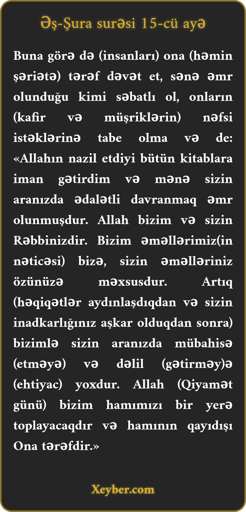 Buna görə də (insanları) ona (həmin şəriətə) tərəf dəvət et, sənə əmr olunduğu kimi səbatlı ol, onların (kafir və müşriklərin) nəfsi istəklərinə tabe olma və de: «Allahın nazil etdiyi bütün kitablara iman gətirdim və mənə sizin aranızda ədalətli davranmaq əmr olunmuşdur. Allah bizim və sizin Rəbbinizdir. Bizim əməllərimiz(in nəticəsi) bizə, sizin əməlləriniz özünüzə məxsusdur. Artıq (həqiqətlər aydınlaşdıqdan və sizin inadkarlığınız aşkar olduqdan sonra) bizimlə sizin aranızda mübahisə (etməyə) və dəlil (gətirməy)ə (ehtiyac) yoxdur. Allah (Qiyamət günü) bizim hamımızı bir yerə toplayacaqdır və hamının qayıdışı Ona tərəfdir.»