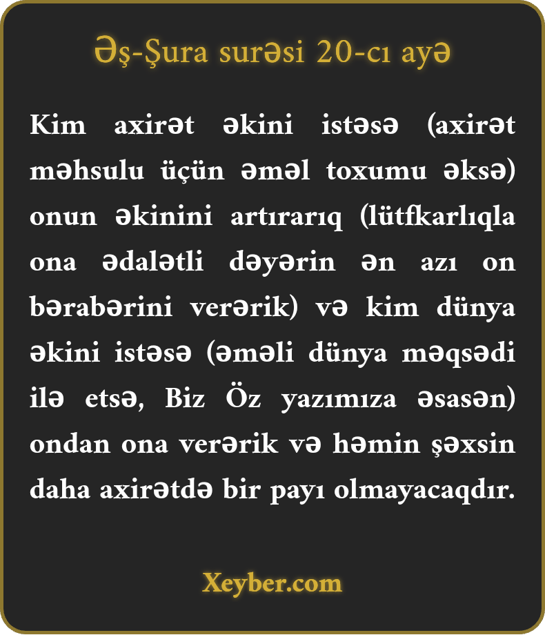 Kim axirət əkini istəsə (axirət məhsulu üçün əməl toxumu əksə) onun əkinini artırarıq (lütfkarlıqla ona ədalətli dəyərin ən azı on bərabərini verərik) və kim dünya əkini istəsə (əməli dünya məqsədi ilə etsə, Biz Öz yazımıza əsasən) ondan ona verərik və həmin şəxsin daha axirətdə bir payı olmayacaqdır.