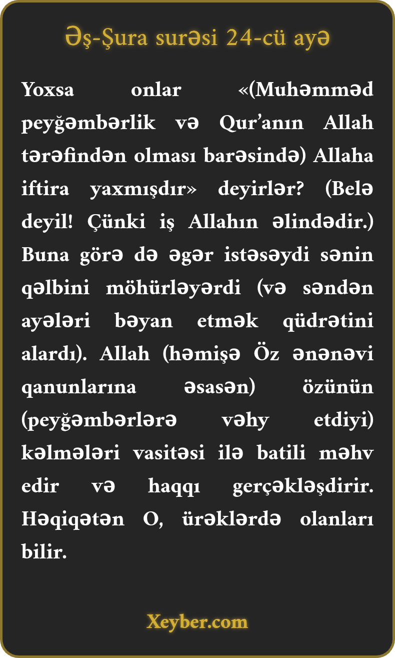 Yoxsa onlar «(Muhəmməd peyğəmbərlik və Qur’anın Allah tərəfindən olması barəsində) Allaha iftira yaxmışdır» deyirlər? (Belə deyil! Çünki iş Allahın əlindədir.) Buna görə də əgər istəsəydi sənin qəlbini möhürləyərdi (və səndən ayələri bəyan etmək qüdrətini alardı). Allah (həmişə Öz ənənəvi qanunlarına əsasən) özünün (peyğəmbərlərə vəhy etdiyi) kəlmələri vasitəsi ilə batili məhv edir və haqqı gerçəkləşdirir. Həqiqətən O, ürəklərdə olanları bilir.