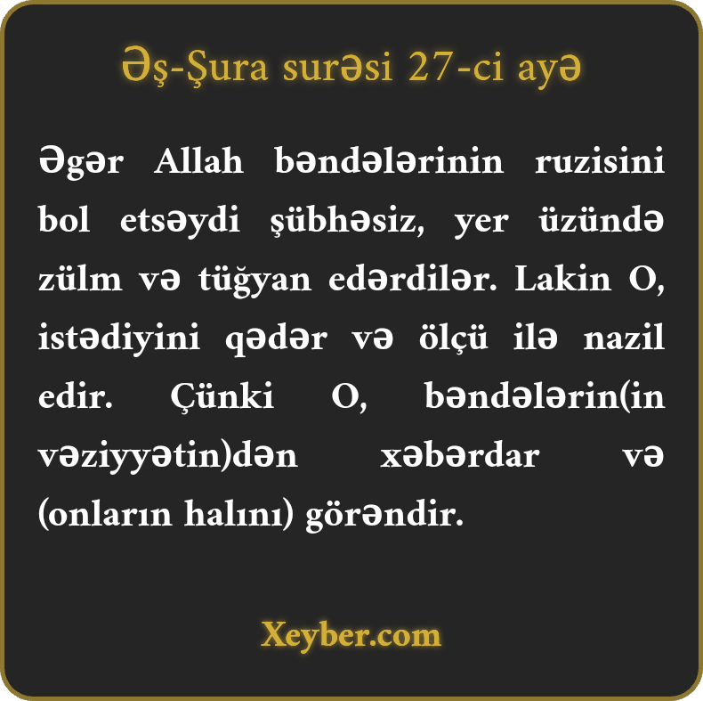Əgər Allah bəndələrinin ruzisini bol etsəydi şübhəsiz, yer üzündə zülm və tüğyan edərdilər. Lakin O, istədiyini qədər və ölçü ilə nazil edir. Çünki O, bəndələrin(in vəziyyətin)dən xəbərdar və (onların halını) görəndir.