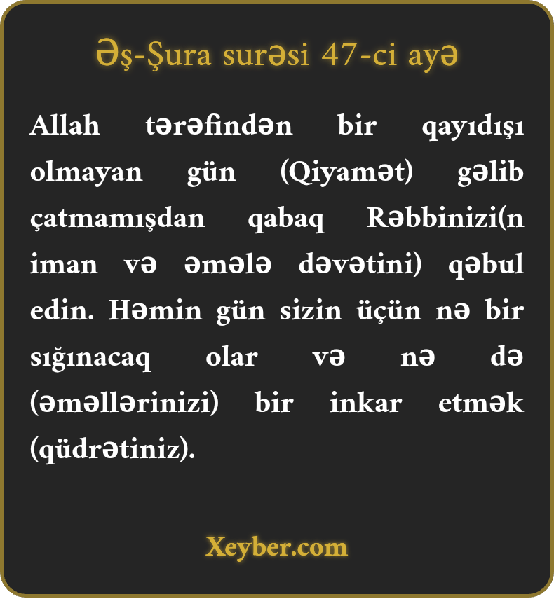 Allah tərəfindən bir qayıdışı olmayan gün (Qiyamət) gəlib çatmamışdan qabaq Rəbbinizi(n iman və əmələ dəvətini) qəbul edin. Həmin gün sizin üçün nə bir sığınacaq olar və nə də (əməllərinizi) bir inkar etmək (qüdrətiniz).