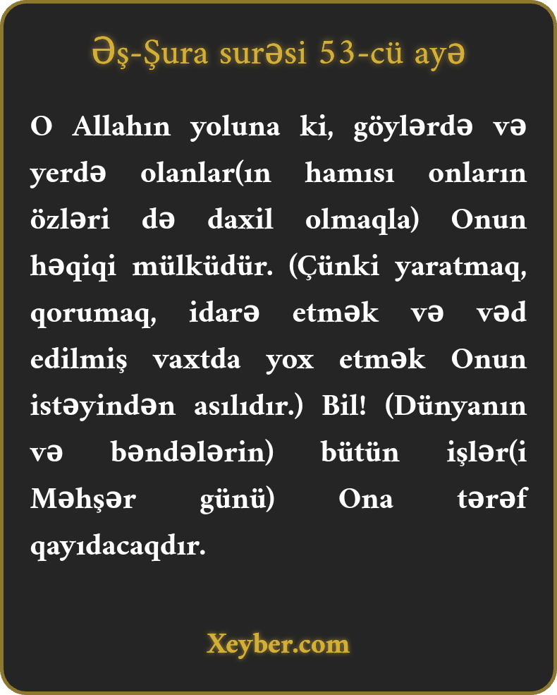 O Allahın yoluna ki, göylərdə və yerdə olanlar(ın hamısı onların özləri də daxil olmaqla) Onun həqiqi mülküdür. (Çünki yaratmaq, qorumaq, idarə etmək və vəd edilmiş vaxtda yox etmək Onun istəyindən asılıdır.) Bil! (Dünyanın və bəndələrin) bütün işlər(i Məhşər günü) Ona tərəf qayıdacaqdır.