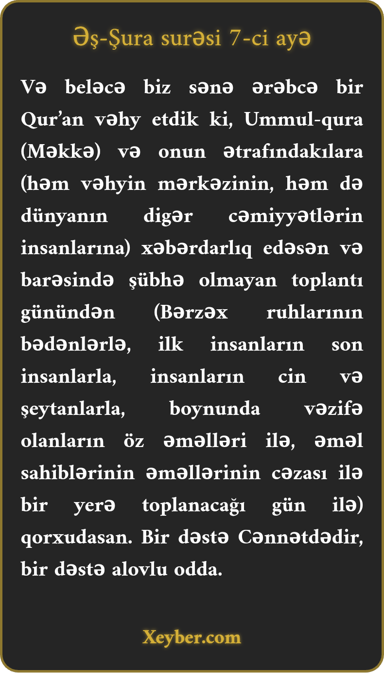 Və beləcə biz sənə ərəbcə bir Qur’an vəhy etdik ki, Ummul-qura (Məkkə) və onun ətrafındakılara (həm vəhyin mərkəzinin, həm də dünyanın digər cəmiyyətlərin insanlarına) xəbərdarlıq edəsən və barəsində şübhə olmayan toplantı günündən (Bərzəx ruhlarının bədənlərlə, ilk insanların son insanlarla, insanların cin və şeytanlarla, boynunda vəzifə olanların öz əməlləri ilə, əməl sahiblərinin əməllərinin cəzası ilə bir yerə toplanacağı gün ilə) qorxudasan. Bir dəstə Cənnətdədir, bir dəstə alovlu odda.