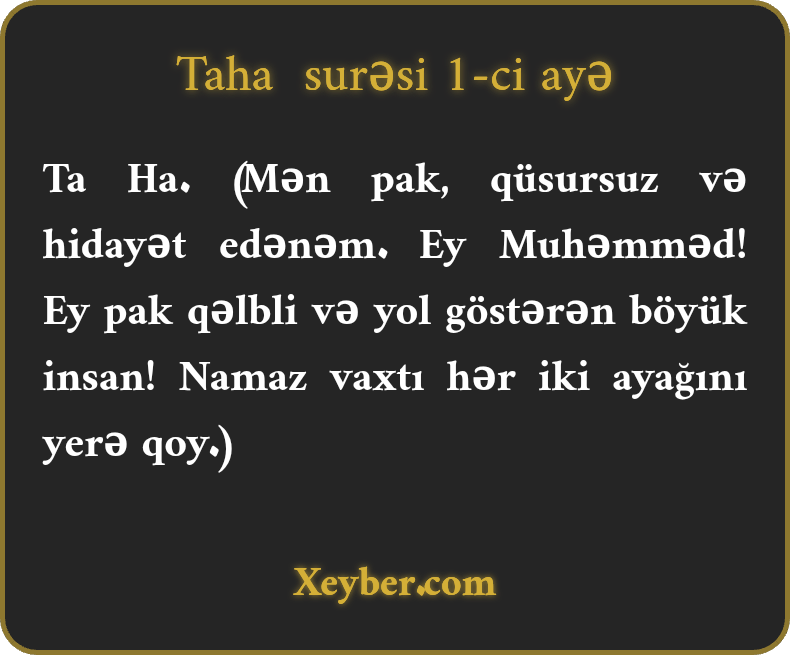 Ta Ha. (Mən pak, qüsursuz və hidayət edənəm. Ey Muhəmməd! Ey pak qəlbli və yol göstərən böyük insan! Namaz vaxtı hər iki ayağını yerə qoy.)