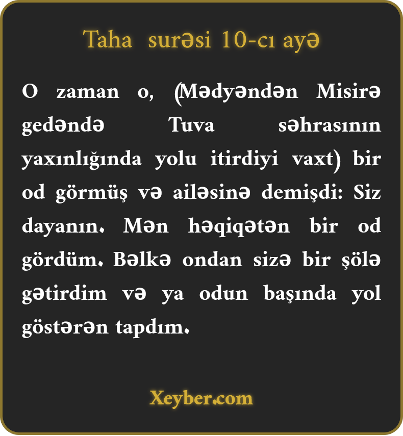 O zaman o, (Mədyəndən Misirə gedəndə Tuva səhrasının yaxınlığında yolu itirdiyi vaxt) bir od görmüş və ailəsinə demişdi: Siz dayanın. Mən həqiqətən bir od gördüm. Bəlkə ondan sizə bir şölə gətirdim və ya odun başında yol göstərən tapdım.