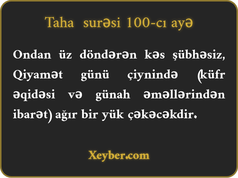 Ondan üz döndərən kəs şübhəsiz, Qiyamət günü çiynində (küfr əqidəsi və günah əməllərindən ibarət) ağır bir yük çəkəcəkdir.