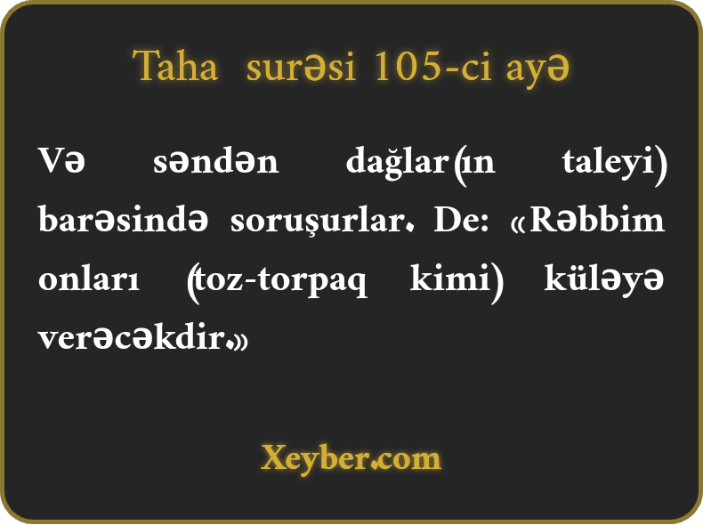 Və səndən dağlar(ın taleyi) barəsində soruşurlar. De: «Rəbbim onları (toz-torpaq kimi) küləyə verəcəkdir.»