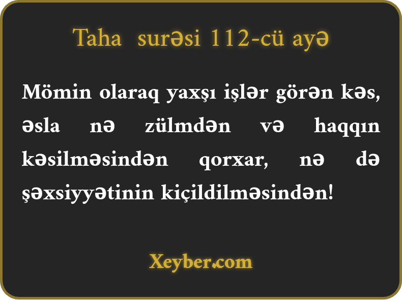 Mömin olaraq yaxşı işlər görən kəs, əsla nə zülmdən və haqqın kəsilməsindən qorxar, nə də şəxsiyyətinin kiçildilməsindən!