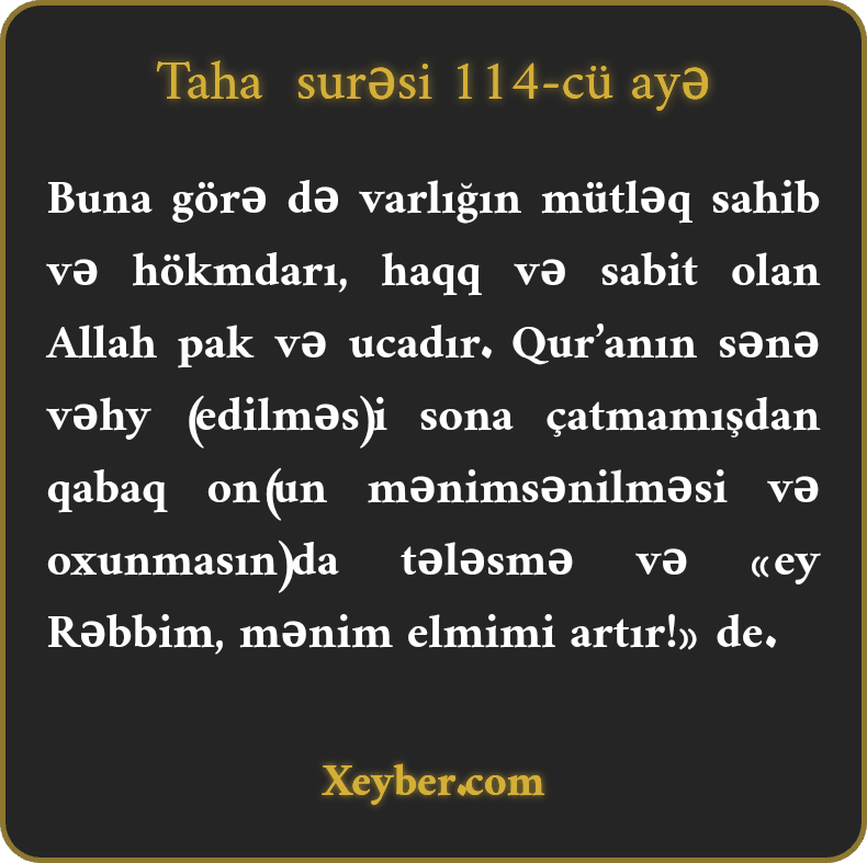 Buna görə də varlığın mütləq sahib və hökmdarı, haqq və sabit olan Allah pak və ucadır. Qur’anın sənə vəhy (edilməs)i sona çatmamışdan qabaq on(un mənimsənilməsi və oxunmasın)da tələsmə və «ey Rəbbim, mənim elmimi artır!» de.