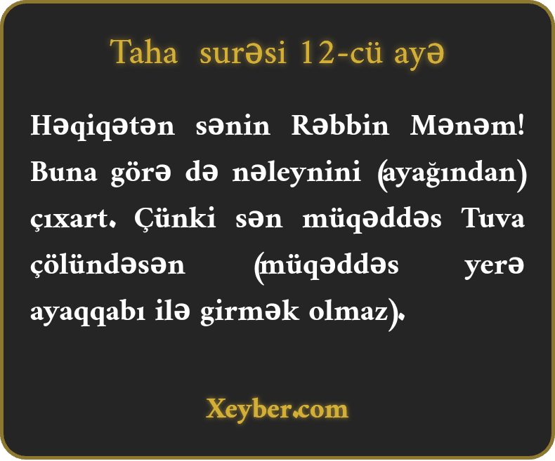 Həqiqətən sənin Rəbbin Mənəm! Buna görə də nəleynini (ayağından) çıxart. Çünki sən müqəddəs Tuva çölündəsən (müqəddəs yerə ayaqqabı ilə girmək olmaz).