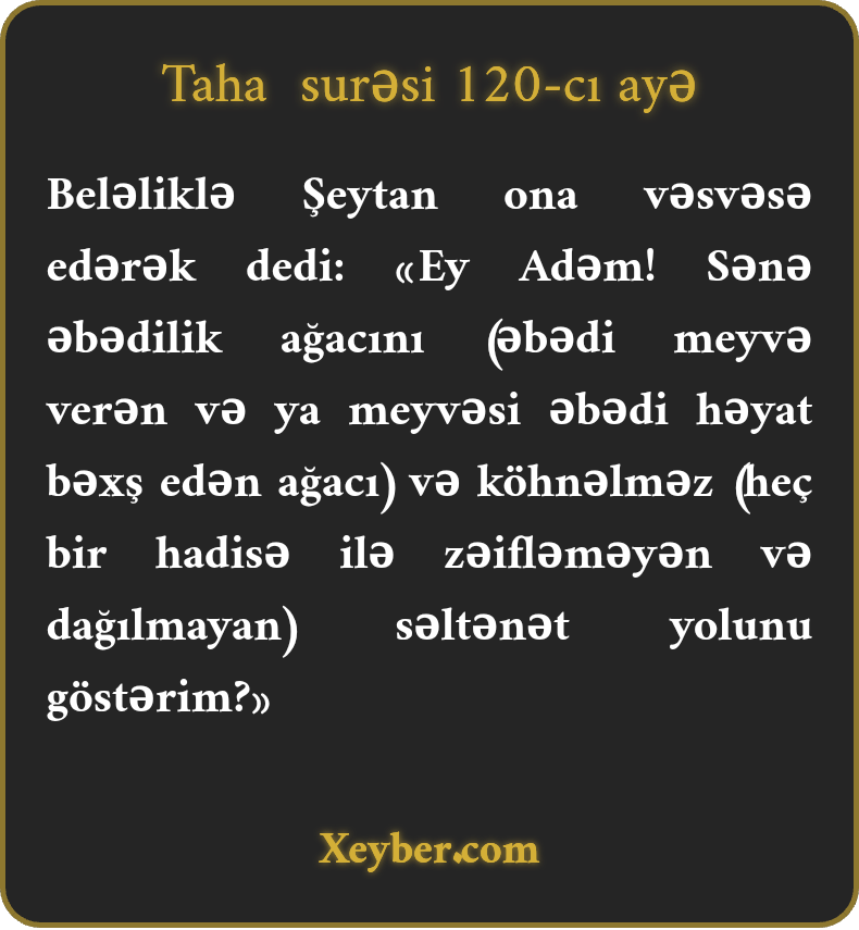 Beləliklə Şeytan ona vəsvəsə edərək dedi: «Ey Adəm! Sənə əbədilik ağacını (əbədi meyvə verən və ya meyvəsi əbədi həyat bəxş edən ağacı) və köhnəlməz (heç bir hadisə ilə zəifləməyən və dağılmayan) səltənət yolunu göstərim?»