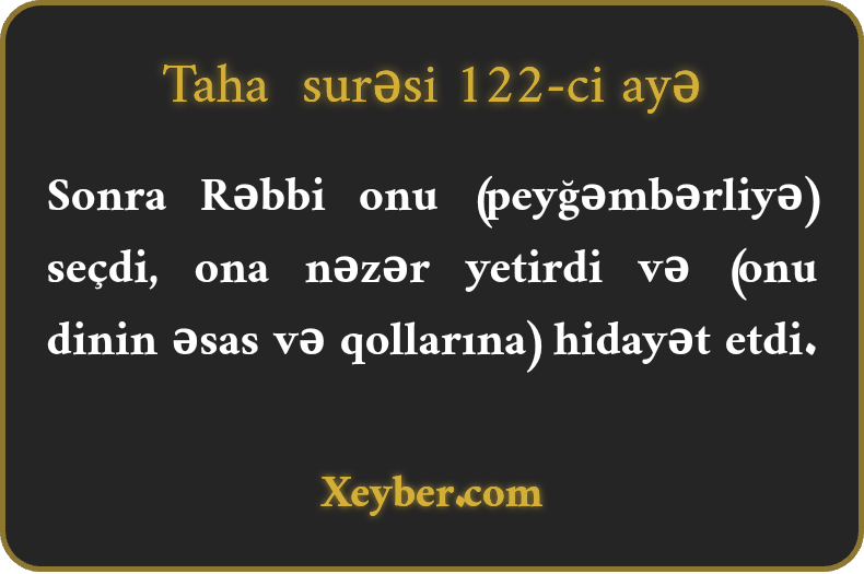 Sonra Rəbbi onu (peyğəmbərliyə) seçdi, ona nəzər yetirdi və (onu dinin əsas və qollarına) hidayət etdi.