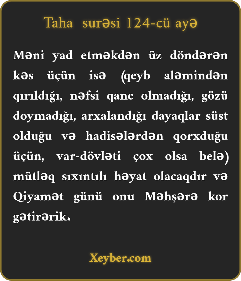 Məni yad etməkdən üz döndərən kəs üçün isə (qeyb aləmindən qırıldığı, nəfsi qane olmadığı, gözü doymadığı, arxalandığı dayaqlar süst olduğu və hadisələrdən qorxduğu üçün, var-dövləti çox olsa belə) mütləq sıxıntılı həyat olacaqdır və Qiyamət günü onu Məhşərə kor gətirərik.