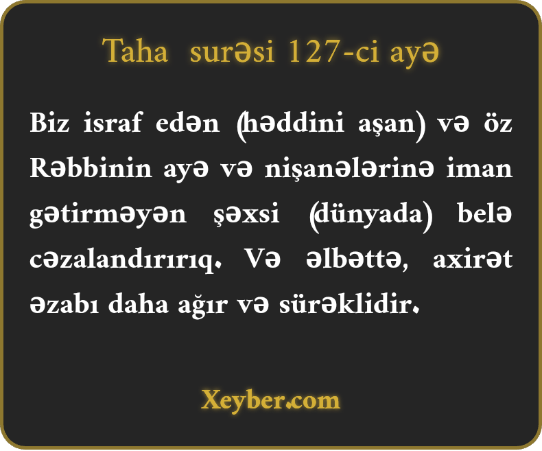 Biz israf edən (həddini aşan) və öz Rəbbinin ayə və nişanələrinə iman gətirməyən şəxsi (dünyada) belə cəzalandırırıq. Və əlbəttə, axirət əzabı daha ağır və sürəklidir.