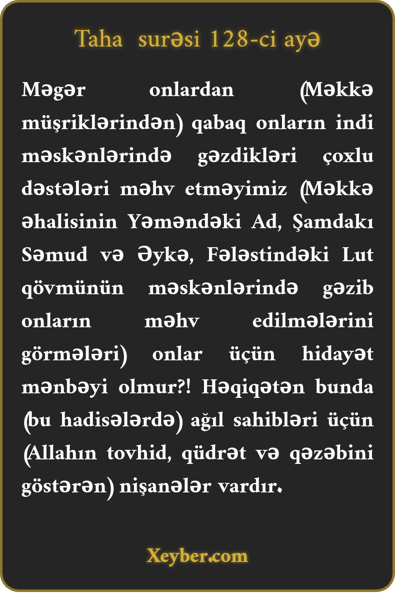 Məgər onlardan (Məkkə müşriklərindən) qabaq onların indi məskənlərində gəzdikləri çoxlu dəstələri məhv etməyimiz (Məkkə əhalisinin Yəməndəki Ad, Şamdakı Səmud və Əykə, Fələstindəki Lut qövmünün məskənlərində gəzib onların məhv edilmələrini görmələri) onlar üçün hidayət mənbəyi olmur?! Həqiqətən bunda (bu hadisələrdə) ağıl sahibləri üçün (Allahın tovhid, qüdrət və qəzəbini göstərən) nişanələr vardır.