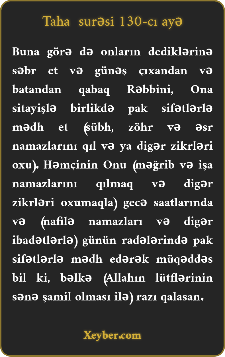 Buna görə də onların dediklərinə səbr et və günəş çıxandan və batandan qabaq Rəbbini, Ona sitayişlə birlikdə pak sifətlərlə mədh et (sübh, zöhr və əsr namazlarını qıl və ya digər zikrləri oxu). Həmçinin Onu (məğrib və işa namazlarını qılmaq və digər zikrləri oxumaqla) gecə saatlarında və (nafilə namazları və digər ibadətlərlə) günün radələrində pak sifətlərlə mədh edərək müqəddəs bil ki, bəlkə (Allahın lütflərinin sənə şamil olması ilə) razı qalasan.