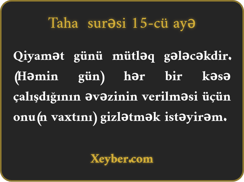 Qiyamət günü mütləq gələcəkdir. (Həmin gün) hər bir kəsə çalışdığının əvəzinin verilməsi üçün onu(n vaxtını) gizlətmək istəyirəm.