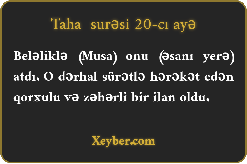 Beləliklə (Musa) onu (əsanı yerə) atdı. O dərhal sürətlə hərəkət edən qorxulu və zəhərli bir ilan oldu.
