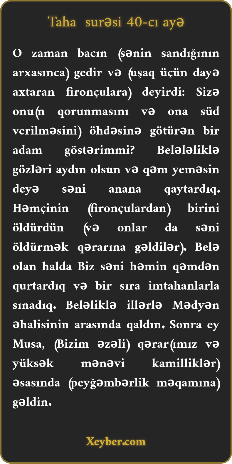 O zaman bacın (sənin sandığının arxasınca) gedir və (uşaq üçün dayə axtaran fironçulara) deyirdi: Sizə onu(n qorunmasını və ona süd verilməsini) öhdəsinə götürən bir adam göstərimmi? Belələliklə gözləri aydın olsun və qəm yeməsin deyə səni anana qaytardıq. Həmçinin (fironçulardan) birini öldürdün (və onlar da səni öldürmək qərarına gəldilər). Belə olan halda Biz səni həmin qəmdən qurtardıq və bir sıra imtahanlarla sınadıq. Beləliklə illərlə Mədyən əhalisinin arasında qaldın. Sonra ey Musa, (Bizim əzəli) qərar(ımız və yüksək mənəvi kamilliklər) əsasında (peyğəmbərlik məqamına) gəldin.