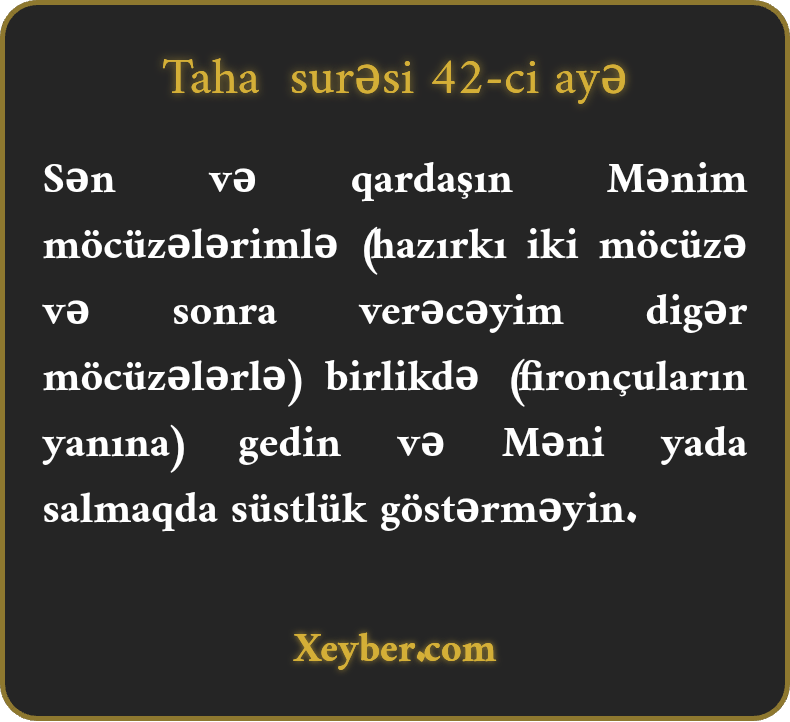Sən və qardaşın Mənim möcüzələrimlə (hazırkı iki möcüzə və sonra verəcəyim digər möcüzələrlə) birlikdə (fironçuların yanına) gedin və Məni yada salmaqda süstlük göstərməyin.