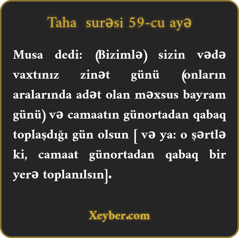 Musa dedi: (Bizimlə) sizin vədə vaxtınız zinət günü (onların aralarında adət olan məxsus bayram günü) və camaatın günortadan qabaq toplaşdığı gün olsun [ və ya: o şərtlə ki, camaat günortadan qabaq bir yerə toplanılsın].