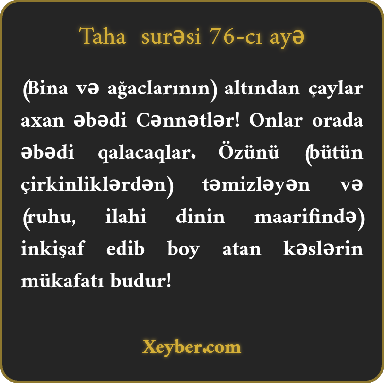 (Bina və ağaclarının) altından çaylar axan əbədi Cənnətlər! Onlar orada əbədi qalacaqlar. Özünü (bütün çirkinliklərdən) təmizləyən və (ruhu, ilahi dinin maarifində) inkişaf edib boy atan kəslərin mükafatı budur!