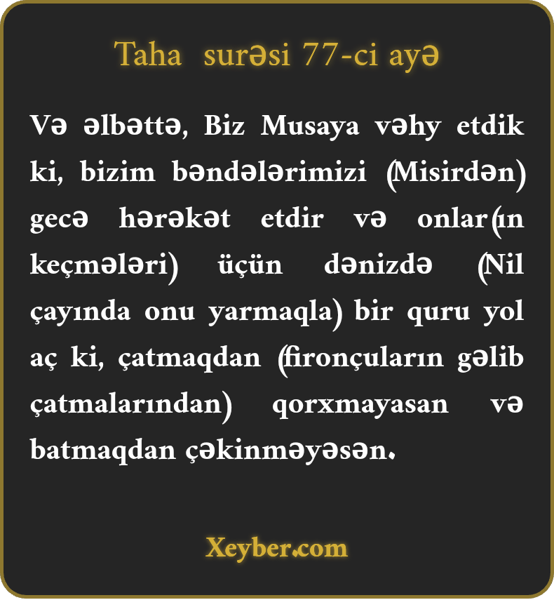 Və əlbəttə, Biz Musaya vəhy etdik ki, bizim bəndələrimizi (Misirdən) gecə hərəkət etdir və onlar(ın keçmələri) üçün dənizdə (Nil çayında onu yarmaqla) bir quru yol aç ki, çatmaqdan (fironçuların gəlib çatmalarından) qorxmayasan və batmaqdan çəkinməyəsən.