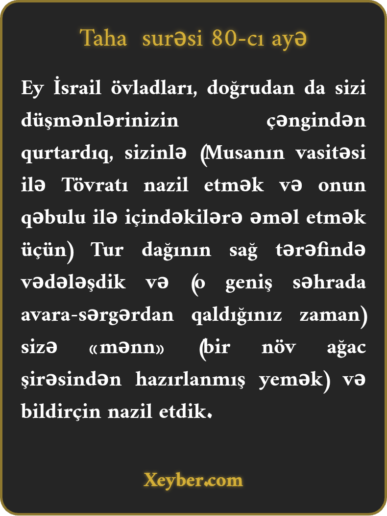 Ey İsrail övladları, doğrudan da sizi düşmənlərinizin çəngindən qurtardıq, sizinlə (Musanın vasitəsi ilə Tövratı nazil etmək və onun qəbulu ilə içindəkilərə əməl etmək üçün) Tur dağının sağ tərəfində vədələşdik və (o geniş səhrada avara-sərgərdan qaldığınız zaman) sizə «mənn» (bir növ ağac şirəsindən hazırlanmış yemək) və bildirçin nazil etdik.
