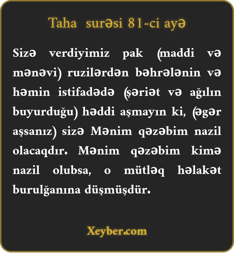 Sizə verdiyimiz pak (maddi və mənəvi) ruzilərdən bəhrələnin və həmin istifadədə (şəriət və ağılın buyurduğu) həddi aşmayın ki, (əgər aşsanız) sizə Mənim qəzəbim nazil olacaqdır. Mənim qəzəbim kimə nazil olubsa, o mütləq həlakət burulğanına düşmüşdür.