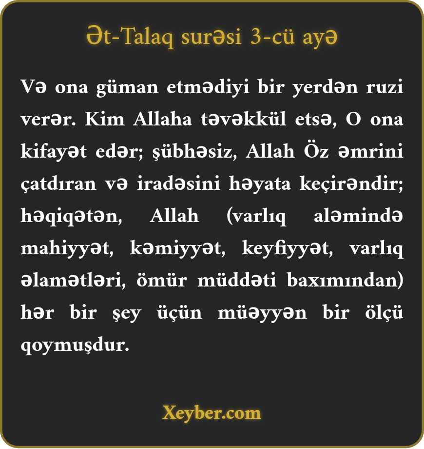 Və ona güman etmədiyi bir yerdən ruzi verər. Kim Allaha təvəkkül etsə, O ona kifayət edər; şübhəsiz, Allah Öz əmrini çatdıran və iradəsini həyata keçirəndir; həqiqətən, Allah (varlıq aləmində mahiyyət, kəmiyyət, keyfiyyət, varlıq əlamətləri, ömür müddəti baxımından) hər bir şey üçün müəyyən bir ölçü qoymuşdur.