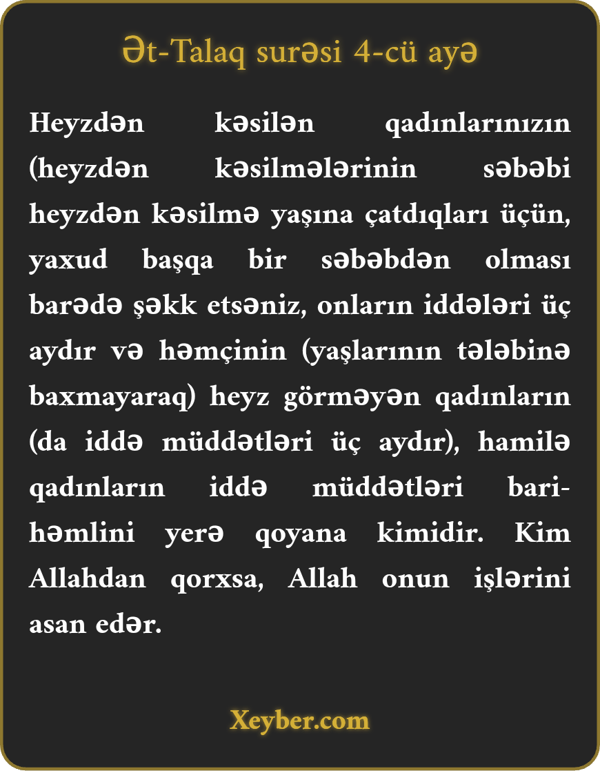Heyzdən kəsilən qadınlarınızın (yaşlarının tələbinə baxmayaraq">(heyzdən kəsilmələrinin səbəbi heyzdən kəsilmə yaşına çatdıqları üçün, yaxud başqa bir səbəbdən olması barədə şəkk etsəniz, onların iddələri üç aydır və həmçinin (yaşlarının tələbinə baxmayaraq) heyz görməyən qadınların (da iddə müddətləri üç aydır), hamilə qadınların iddə müddətləri bari-həmlini yerə qoyana kimidir. Kim Allahdan qorxsa, Allah onun işlərini asan edər.