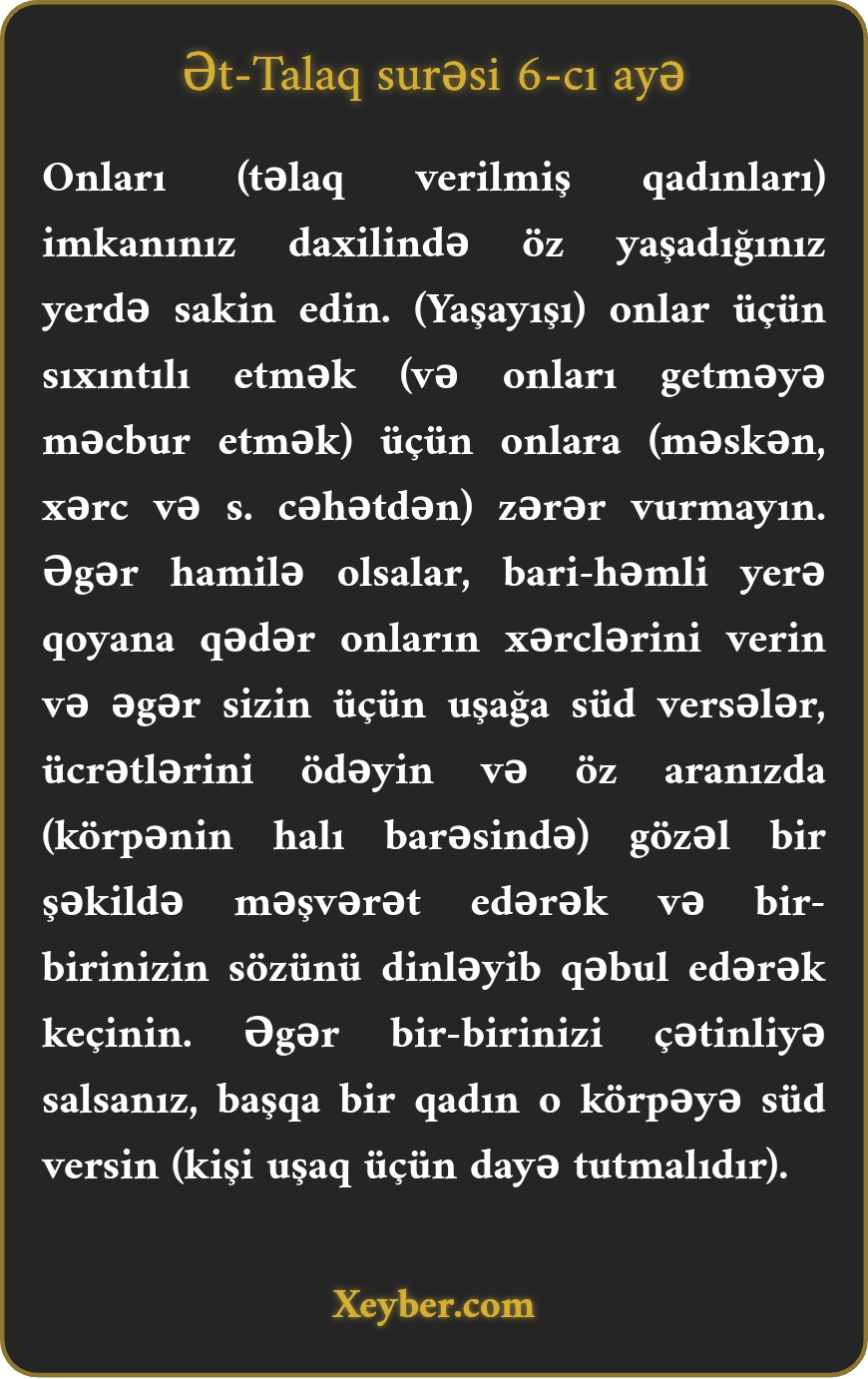 Onları (təlaq verilmiş qadınları) imkanınız daxilində öz yaşadığınız yerdə sakin edin. (Yaşayışı) onlar üçün sıxıntılı etmək (və onları getməyə məcbur etmək) üçün onlara (məskən, xərc və s. cəhətdən) zərər vurmayın. Əgər hamilə olsalar, bari-həmli yerə qoyana qədər onların xərclərini verin və əgər sizin üçün uşağa süd versələr, ücrətlərini ödəyin və öz aranızda (körpənin halı barəsində) gözəl bir şəkildə məşvərət edərək və bir-birinizin sözünü dinləyib qəbul edərək keçinin. Əgər bir-birinizi çətinliyə salsanız, başqa bir qadın o körpəyə süd versin (kişi uşaq üçün dayə tutmalıdır).