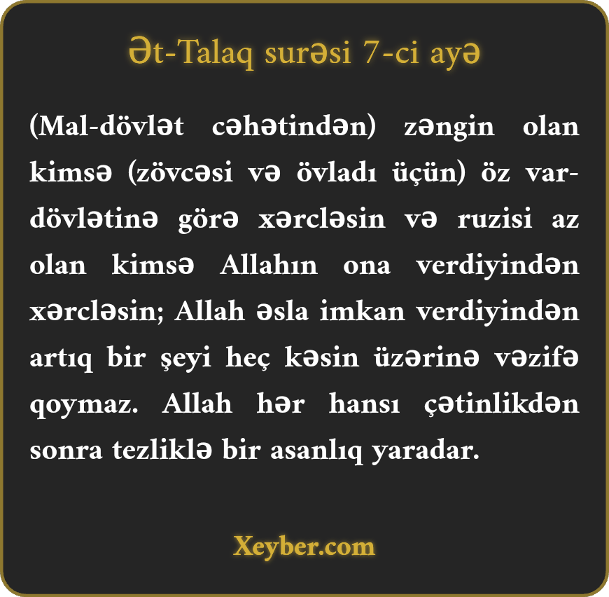 (Mal-dövlət cəhətindən) zəngin olan kimsə (zövcəsi və övladı üçün) öz var-dövlətinə görə xərcləsin və ruzisi az olan kimsə Allahın ona verdiyindən xərcləsin; Allah əsla imkan verdiyindən artıq bir şeyi heç kəsin üzərinə vəzifə qoymaz. Allah hər hansı çətinlikdən sonra tezliklə bir asanlıq yaradar.