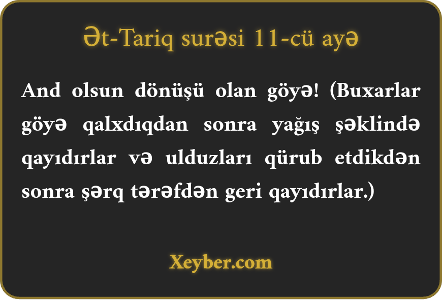 And olsun dönüşü olan göyə! (Buxarlar göyə qalxdıqdan sonra yağış şəklində qayıdırlar və ulduzları qürub etdikdən sonra şərq tərəfdən geri qayıdırlar.)