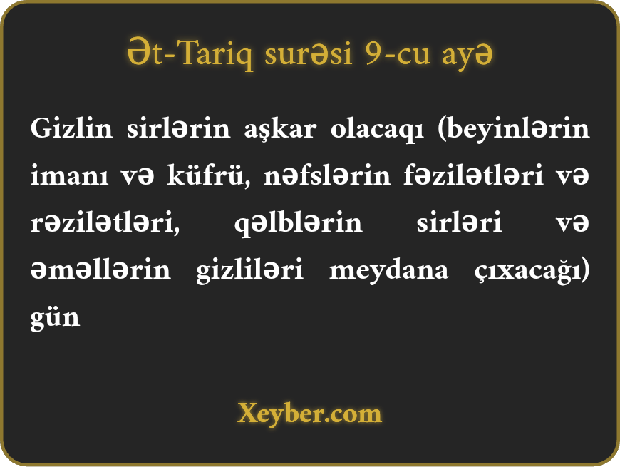 Gizlin sirlərin aşkar olacaqı (beyinlərin imanı və küfrü, nəfslərin fəzilətləri və rəzilətləri, qəlblərin sirləri və əməllərin gizliləri meydana çıxacağı) gün