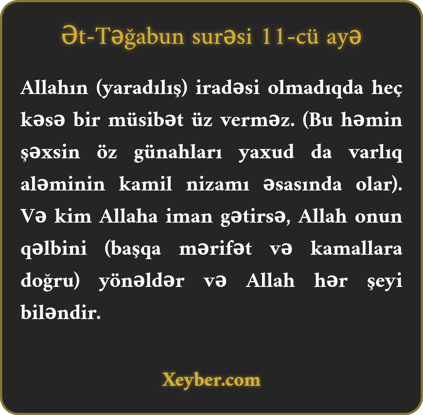 Allahın (yaradılış) iradəsi olmadıqda heç kəsə bir müsibət üz verməz. (Bu həmin şəxsin öz günahları yaxud da varlıq aləminin kamil nizamı əsasında olar). Və kim Allaha iman gətirsə, Allah onun qəlbini (başqa mərifət və kamallara doğru) yönəldər və Allah hər şeyi biləndir.