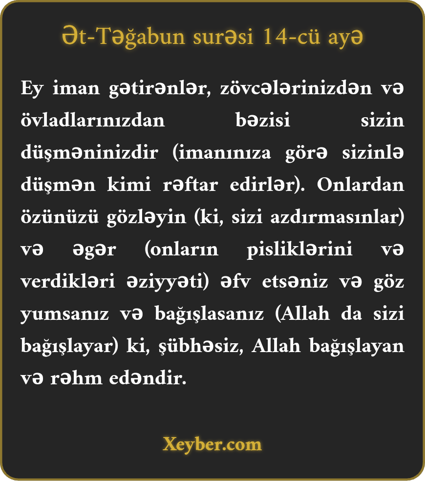 Ey iman gətirənlər, zövcələrinizdən və övladlarınızdan bəzisi sizin düşməninizdir (imanınıza görə sizinlə düşmən kimi rəftar edirlər). Onlardan özünüzü gözləyin (ki, sizi azdırmasınlar) və əgər (onların pisliklərini və verdikləri əziyyəti) əfv etsəniz və göz yumsanız və bağışlasanız (Allah da sizi bağışlayar) ki, şübhəsiz, Allah bağışlayan və rəhm edəndir.